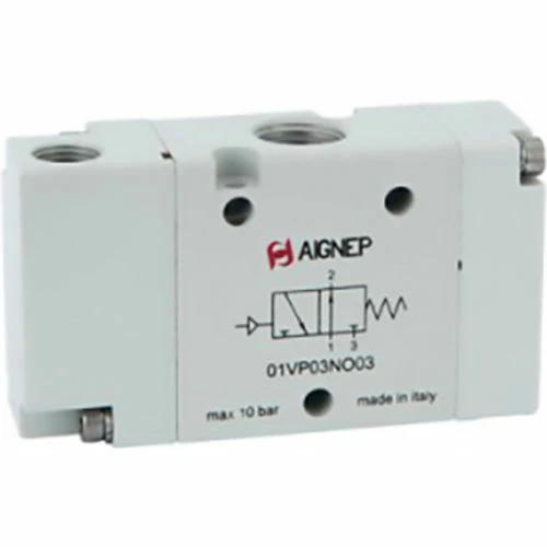 Aignep USA’s 01VL series pneumatic hand-actuated lever valves provide a high quality control solution for your pneumatic cylinders, components and operations. Actions available are 3/2, 5/2 and 5/3, the latter offered in closed, pressure and open centers. Port sizes are offered in 1/8, 1/4 and 1/2 inch NPT and BSPP threads. Flow rates are 740 NL/min for 1/8″ ports, 1200 NL/min for 1/4″ ports and 5000 NL/min for 1/2″ ports. All valves operate up to 145 psi working pressure. Durable NBR seals allow the valves to operate between 14 – 140 degrees F. The body is comprised of anodized and painted aluminum, where the spool is chemical nickel plated steel.