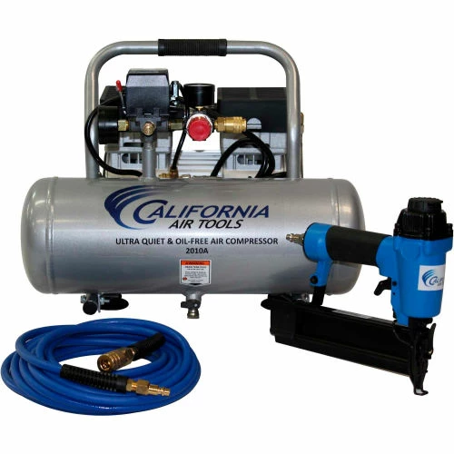 The California Air Tools2010AGK18 Ultra Quiet & Oil-FreeAir Compressor is designed to be one of the quietest air compressors in the industry having only60 decibels of sound. The powerful1.0 motor operates at only 1680 RPM creating less noise and less wear. The Oil-Free Dual Piston Pump System is engineered for high performance and durability. TheCAT-2010AGK18Air Compressorhas an Oil-Free Dual Piston pump designed to have a life cycle before wear of3000 plus hours compared to other comparable air compressors with life cycles of500 hours or less. The Oil-Free pump allows for use in a variety of temperatures and uneven terrains. The2.0 GallonAluminum (Rust-Free) Air Tank is Lightweight (35 lbs) and very easy to transport. The 25ft Hybrid Air Hose (included) is lightweight and very flexible. The air hose comes complete with 2 air fittings attached. These air fittings allow you to attach to the air hose to the air compressor and to the nail gun or other air tools. The 18 Gauge Brad Nail Gun (included) is designed for nailing trim, cabinetry and hobby/craft projects (3/8″ – 2″ brad nails). This air compressor is ideal for anyone working inside where noise is a major issue.