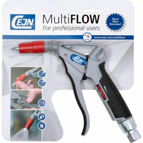 Cejn’s new MultiFLOW blowgun effectively cleans surfaces with air or water with unparalleled blowing force. Precise flow is achieved by adjustable flow settings. Nozzle adjusts from narrow jet to wide beam. The MultiFLOW meets and exceeds OSHA safety standards when dead-ended.