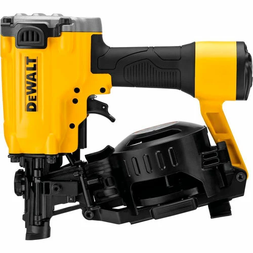The DW45RN Roofing Nailer has a robust engine and feed system for durability and long life, and steel skid plates with rubber inserts to protect the tool and help stop it from sliding during use. It also comes with a depth adjustment wheel with numbered detents to help drive nails to the proper depth into a variety of materials. It is has an ergonomic design that is lighter than leading competitive coil roofing nailers.