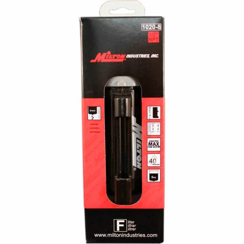 This 1/2″ NPT Milton micro filter is supplied with pre-assembled automatic overnight drain which will operate when an air supply is shut down or when liquid has gathered in the filter bowl. The included 3 stage baffle system offers exceptional moisture removal. This micro filter includes a porous bronze sintered 40 micron filter element which allows less pressure drops and longer cleaning intervals. Micro filters remove harmful water or oil condensate pipe scale dirt and rust from compressed air systems and are used as pre-filters to coalescing type filters to ensure high efficiency and long element life. The corrosion resistant metal bowl has a capacity of 6 ounces. Maximum of 250 PSI and 100 SCFM.
