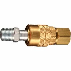 M style coupler and plug kit includes one 1/4″ FNPT coupler and one 1/4″ MNPT plug. Made up of a brass body, brass sleeve coupler and steel plug. With a 1/4″ basic flow size and air flow of 40 SCFM, this coupler and plug combination has a maximum pressure of 300 PSI and a Buna-N seal.
