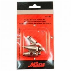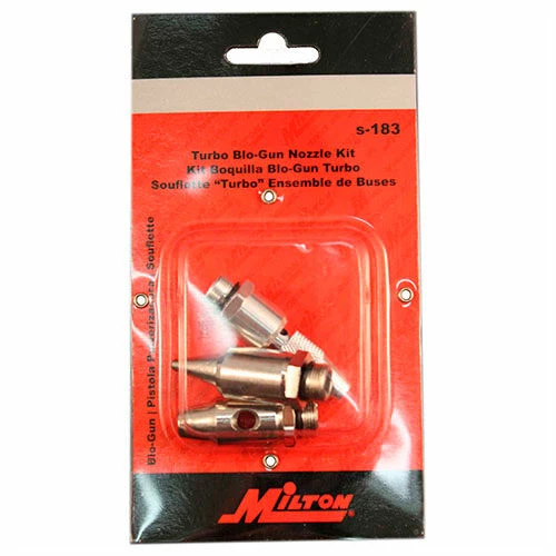Three piece turbo Blow Gun nozzle kit is perfect for adding versatility to Milton Turbo Blow Guns. Simply thread nozzle onto the end of the S-181 or S-182 turbo Blow Gun. One of each: Adjustable, High Volume and Fan Spray For Milton #S-181 and #S-182.