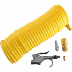 Four piece Re Koil hose safety Blow Gun kit comes with one 1/4″ NPT Blow Gun, one 1/4″ FNPT coupler, one 1/4″ MNPT plug and one 25 foot Re Koil hose. This kit is great for garage or shop. Simply connect to overhead air lines to keep hoses off the floor.