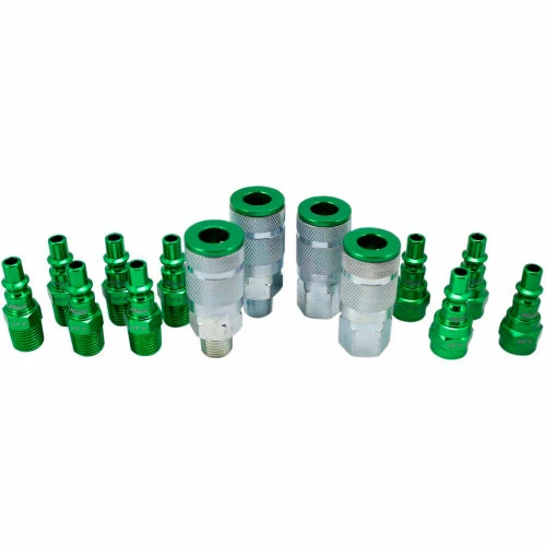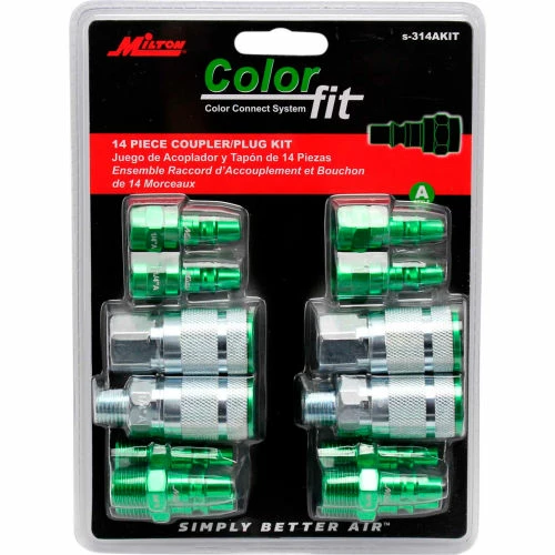 MILTON 14 Piece A style ColorFit set is a customized color code system that allows for easy matching of couplers and plugs among the standard Industrial pneumatic air coupler quick connects. Great way to solve that annoying problem of potential crossing contaminating different air lines. By dedicating certain colors to different air lines, this will eliminate the risk of mixing a lubricated line with a dry air line which will help prolong your applications and quickly finish any project. Each piece coated with Anodized Green aluminum and heavy duty steel sleeves to prevent scratches or dulling of the coupler and plug.