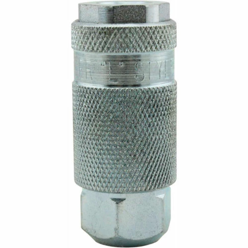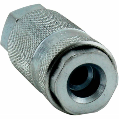 1/4″ FNPT L style coupler is steel plated to resist rust. L style couplers have a 1/4″ basic flow size and a maximum pressure of 300 PSI. This push type coupler has a maximum of 32 SCFM and a Buna-N seal.
